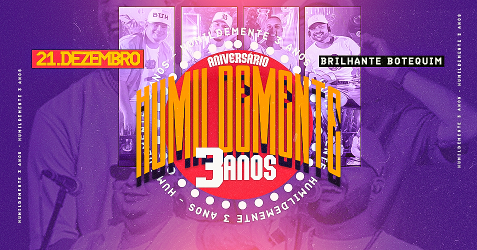 Não perca a comemoração mais esperada do ano! O Grupo Humildemente está completando 3 anos de sucesso no Brilhante Botequim e você está convidado para a festa!